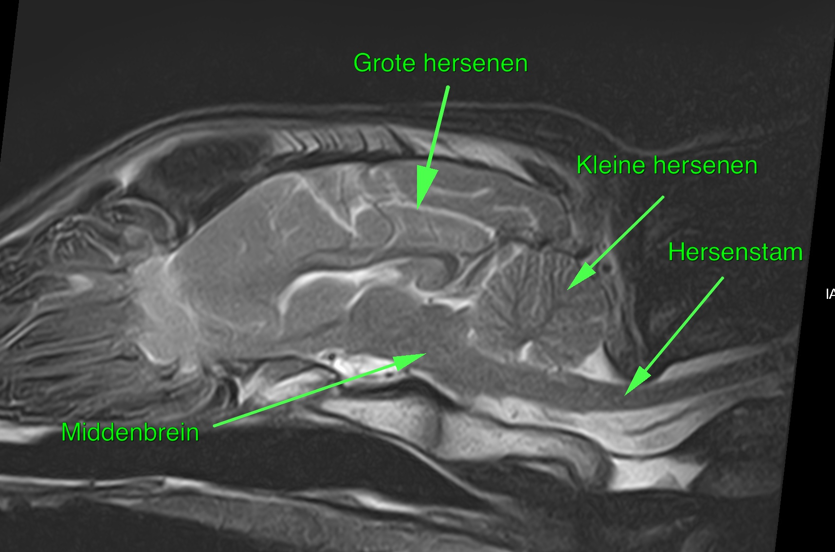 Het steeds kleiner maken van honden heeft een keerzijde. Want bij uitstek bij de kleinere honden, de toybreeds, zien we onder meer twee aandoeningen vaker voorkomen: chiari-like malformatie (CM) en syringomyelie (SM). Vaak wordt naar deze aandoeningen verwezen met kreten als ‘de te kleine schedel en te veel hersenen’ maar zo simplistisch is dit niet. Chiari-like malformatie is een aandoening waarbij de kleine hersenen (het cerebellum) door het achterhoofdsgat (foramen magnum) uitpuilen. Dat is niet normaal. In de schedel liggen de grote en kleine hersenen, het middenbrein, de hersenstam en door het achterhoofdsgat treedt de hersenstam naar buiten om vervolgens over te gaan in het ruggenmerg (figuur 1).