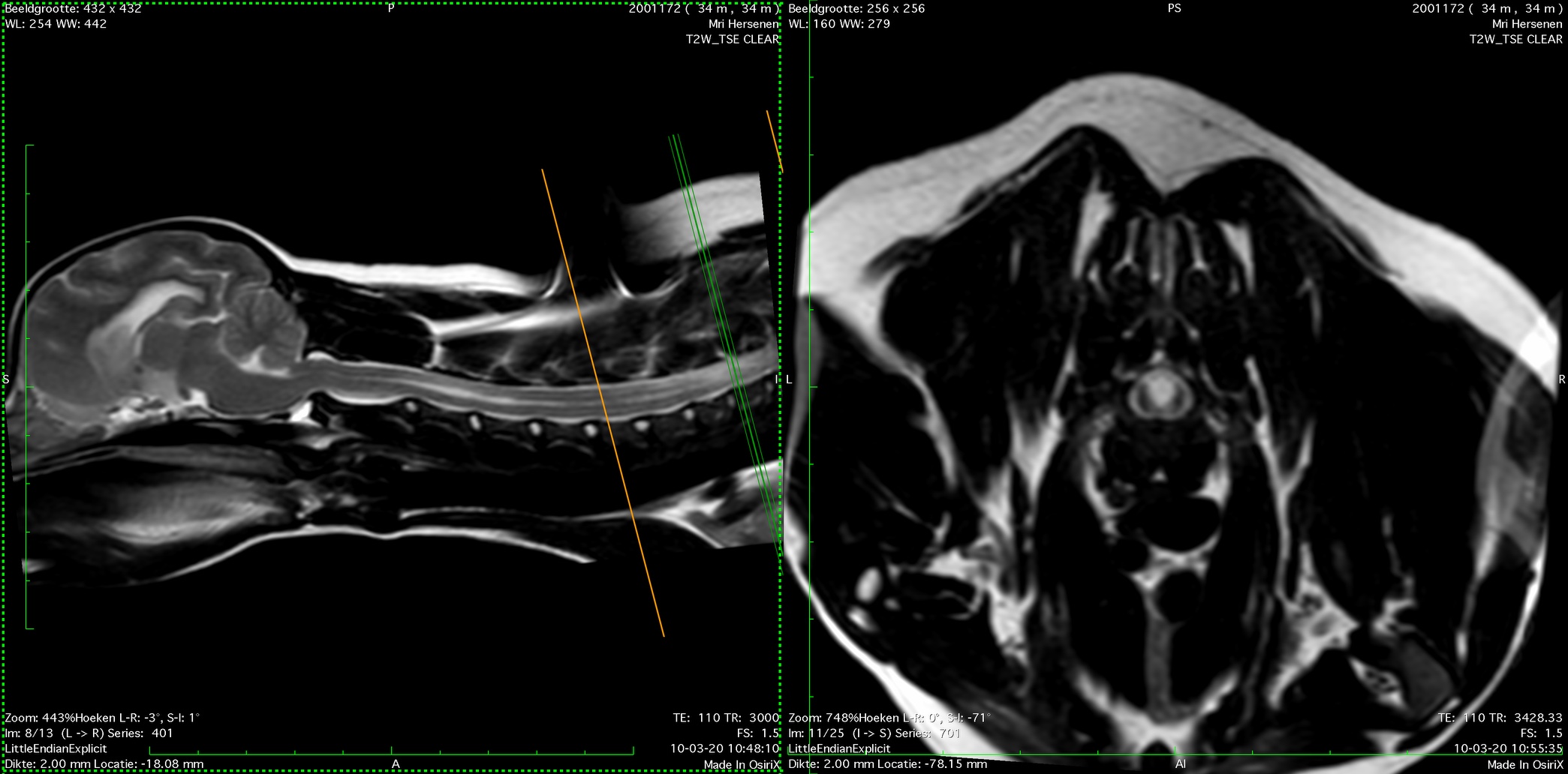 SM is het beste te beoordelen op een combinatie van een lengtedoorsnede van het ruggenmerg (sagittale opname) en dwarsdoorsnede op verschillende plaatsen in het ruggenmerg (transversale of axiale opname). Bij de CKCS zit de syrinx in de regel ter hoogte van de tweede en derde halswervel dus hebben we als wetenschappers afgesproken om bij een zogenaamde CKCS screenings MRI naar het gebied van de 2de tot en met de 4de halswervel te kijken. Bij Chihuahua's en Dwergkezen is het verstandig het gebied veel groter te maken. Regelmatig zien we bij die rassen de syrinxvorming ontstaan in het wervelkanaal ter hoogte van de borstwervels.