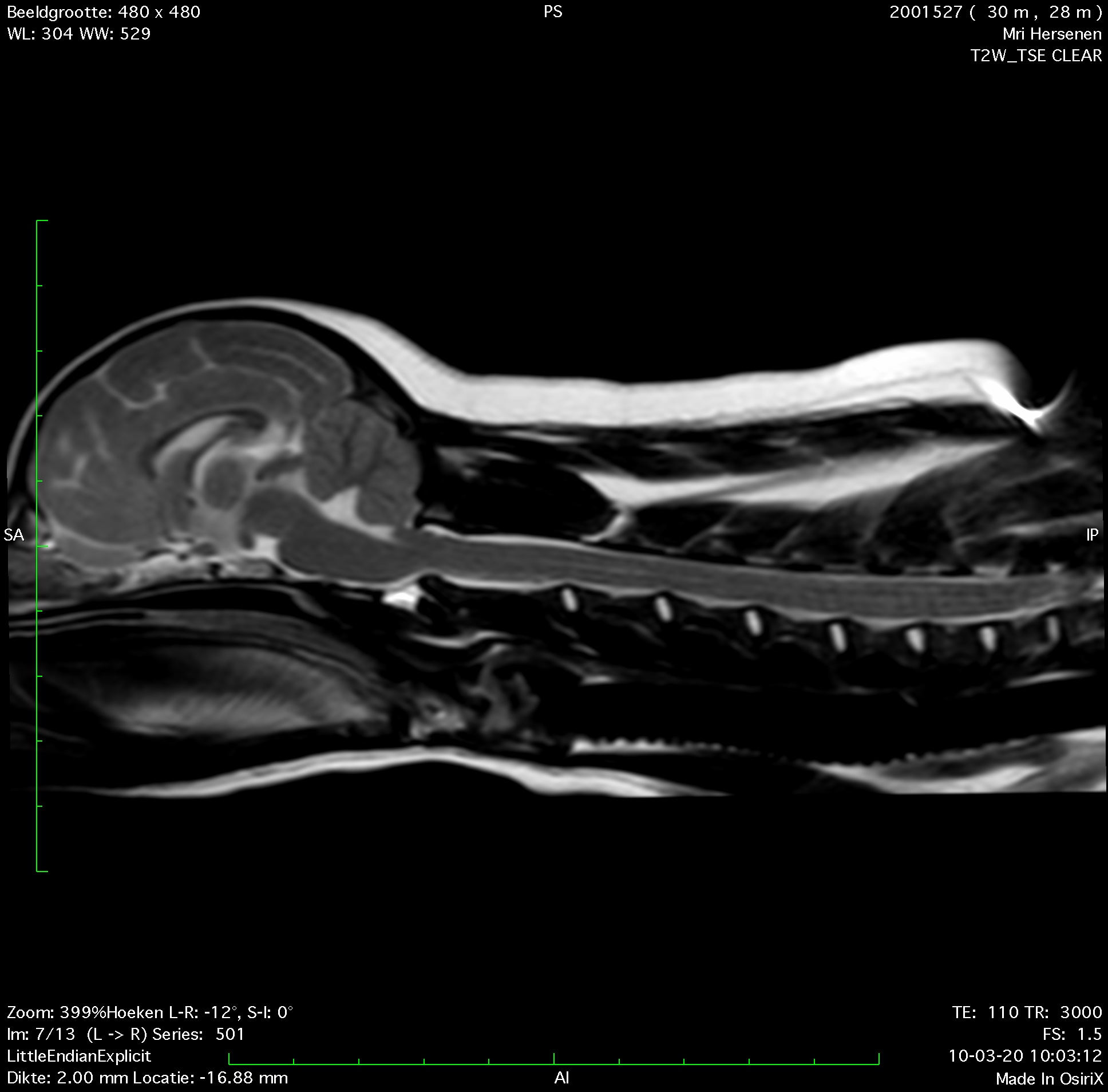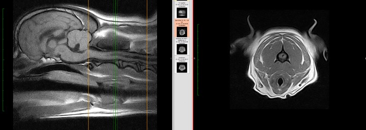 CM is dus het uitpuilen van de kleine hersenen door het achterhoofdsgat en deze diagnose kun je zowel met een CT scan als MRI scan in beeld brengen. Echter een CT scan werkt met röntgenstralen en is ongeschikt om een goede indruk te krijgen van het zenuwweefsel. Met een CT scan kun je SM niet beoordelen en slechts zeer beperkt iets zeggen over de hersenen en het ruggenmerg. Het is dus bij uitstek een MRI diagnose. Een MRI scanner werkt met een hele sterke magneet. In de diergeneeskunde gebruiken we zowel low field (0,2-0,4 Tesla) als high field scanners (> 1 Tesla). Hoe hoger de magneetsterkte hoe mooier het beeld kan worden, hoe sneller je kunt scannen.