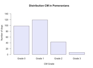 Bij de CKCS heeft dus het merendeel van alle CKCS CM. Dat maakt het erg moeilijk om vast te stellen of ze hier last van hebben. De meeste eigenaren zien bij hun CKCS, die alleen CM heeft, weinig tot geen klinische beelden. Anders is dit bij de Dwergkeeshond. Inmiddels hebben we een groep van ruim 1000 Dwergkeeshonden middels MRI onderzocht en deze honden zijn dus uitgebreid beschreven. Recent hebben we onze eerste studie over dit onderwerp gepubliceerd (zie hierboven). Klinische beelden die door de eigenaren gerapporteerd worden zijn: luchtlikken, schudden met het hoofd, frequent slikken, fantoom krabben de achterpoot, met het hoofdje ergens langs strijken, pijn bij aanraking en knijpen met de oogjes. Met name dit laatste klinische beeld is ook bij de CKCS beschreven. Opvallend is echter dat in onze studie slechts 10 tot 30% van de Dwergkeeshonden met CM een of meerdere van deze klinische beelden had. De andere eigenaren wiens hond CM heeft zagen deze klinische beelden niet. Dit wil zeggen dat we een hele grote groep van Dwergkeeshonden hebben met CM waarvan de eigenaar aangeeft dat de hond niets mankeert. Nu is de mate van CM wel van betekenis. Het merendeel van de Dwergkeeshonden heeft een zeer geringe CM (zie figuur 6). CM graad 1 is een zeer milde vorm van herniatie waarbij er mogelijk geen klinische beelden optreden. Anders is dit voor graad 3 en 4. Hierbij is de herniatie fors (zie figuur 4). Ongeacht of ze allemaal klinische beelden krijgen moeten we wel stellen dat CM niet aanwezig moet zijn. Zelfs als het een afwijking is die slechts bij 10% van de honden zichtbaar klinische beelden veroorzaakt is het een niet gewenste afwijking. Sommige auteurs gebruiken de term CM-P als de CM geassocieerd is met pijn.